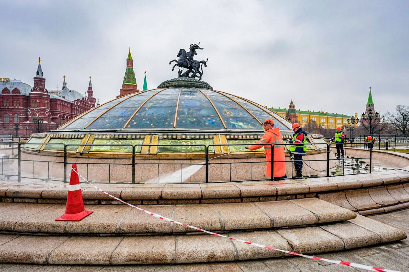 Комплекс фонтанов на Манежной площади очистили и промыли накануне зимы