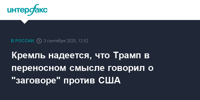 Москва. 3 сентября. INTERFAX.RU - В Кремле надеются, что слова президента США Дональда Трампа о "заговоре" между РФ, КНР и КНДР против Соединенных Штатов были использованы в переносном смысле, никто не строит никаких заговоров.