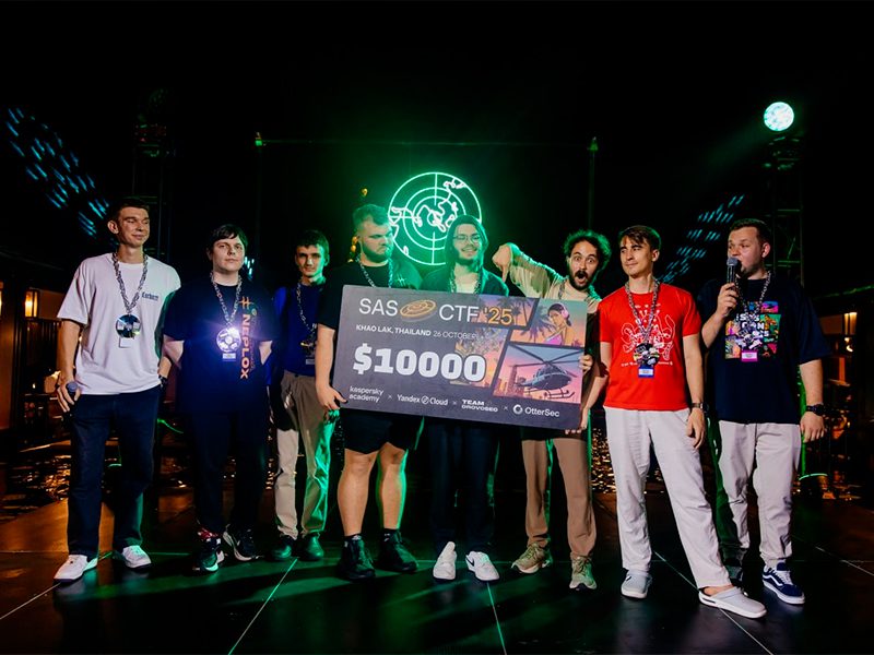 Команда победителей во время награждения. Фото (с) «Лаборатория Касперского»Спонсорами SAS CTF 2025 выступили Kaspersky Academy и OtterSec, группа независимых исследователей в области безопасности. Главным технологическим партнёром соревнований стала платформа Yandex Cloud, которая бесплатно предоставила облачную инфраструктуру для проведения соревнований.