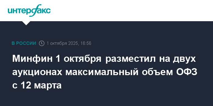 Минфин 1 октября разместил на двух аукционах максимальный объем ОФЗ с 12 марта