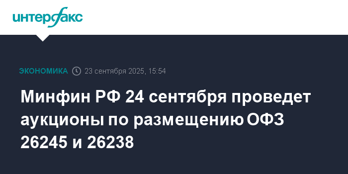 Минфин РФ 24 сентября проведет аукционы по размещению ОФЗ 26245 и 26238