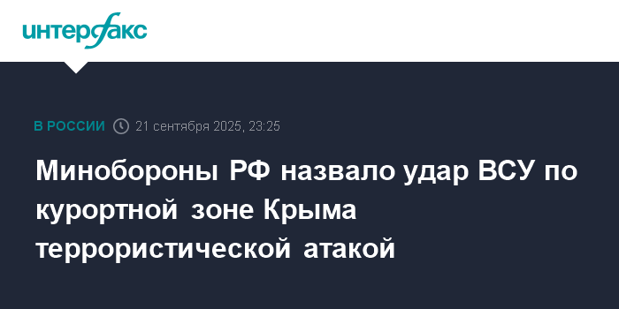 Москва. 21 сентября. INTERFAX.RU - В Минобороны России заявили, что расценивают украинский удар по курортной зоне Крыма как преднамеренную террористическую атаку.