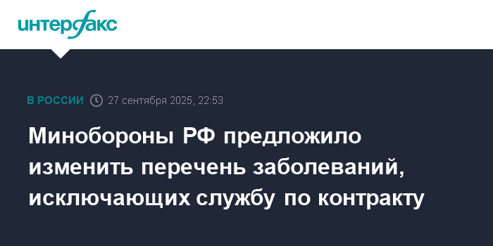 Москва. 27 сентября. INTERFAX.RU - Минобороны России разработало проект приказа, который расширяет список заболеваний, при наличии которых ограниченно годные к военной службе лица не могут заключить с ведомством контракт в период мобилизации, военного положения.