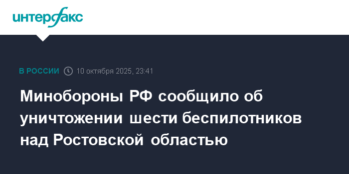 Минобороны РФ сообщило об уничтожении шести беспилотников над Ростовской областью