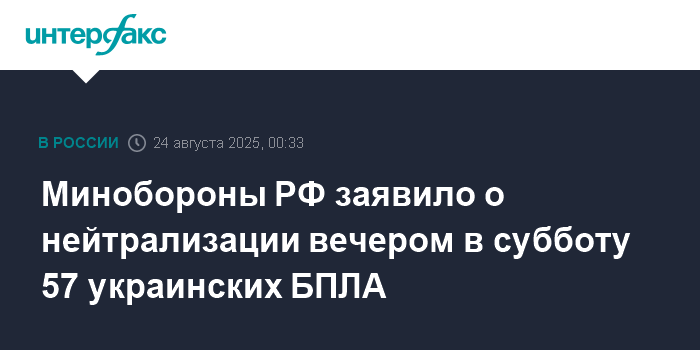 Москва. 24 августа. INTERFAX.RU - Российские военные в субботу с 17:00 до 23:30 мск перехватили и уничтожили 57 украинских беспилотников над российскими регионами, сообщило Минобороны РФ.