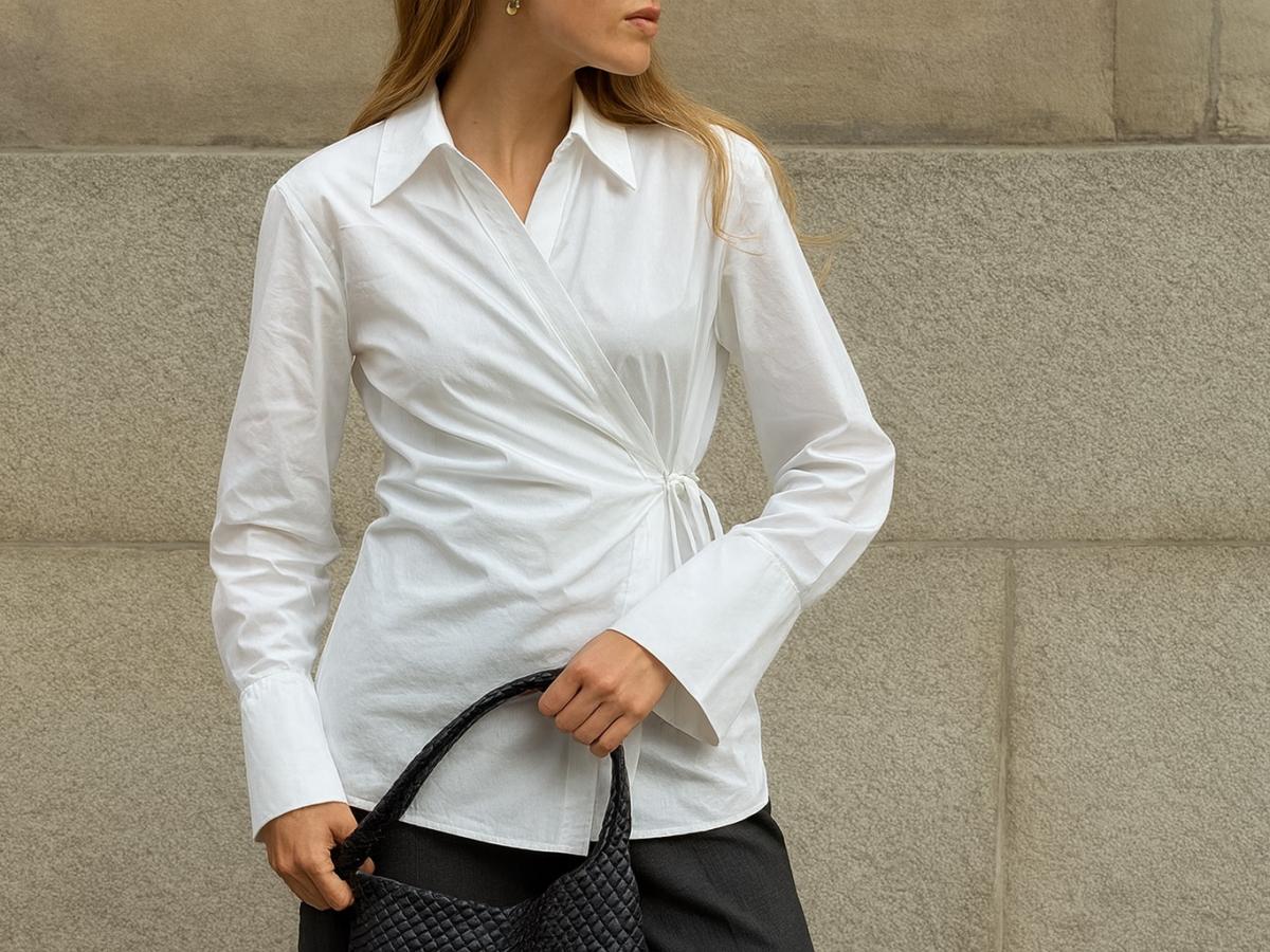 Фото: Generated by AI (DALL·E 3 by OpenAI) is licensed under Free for commercial use (OpenAI License) Белая рубашка и черная сумкаТеперь акцент смещён с широких моделей на приталенные варианты, напоминающие эпоху офисной эстетики начала 2000-х. Такие рубашки не ограничены деловым дресс-кодом: они гармонично вписываются и в минималистичные повседневные образы, и в наряды с романтичным или дерзким характером.