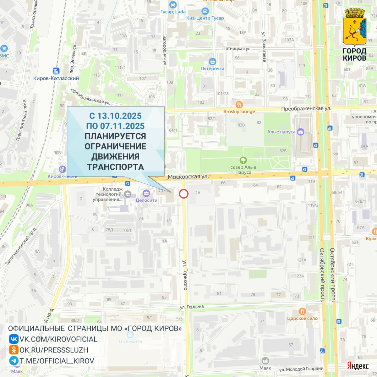 13 октября в Кирове будет ограничено движение транспорта на улице Горького в районе дома №2. Об этом сообщили в городской администрации.
