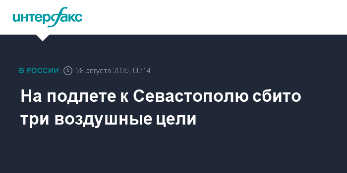 Москва. 28 августа. INTERFAX.RU - Средствами ПВО уничтожено три воздушные цели над Черным морем у Севастополя, сообщил губернатор Михаил Развожаев.