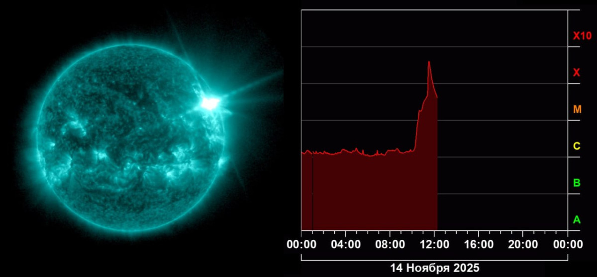 В пятницу, 14 ноября, на Солнце зафиксировали вспышку класса X4.05 — это второй по силе выброс энергии за весь 2025 год. Она случилась в той же зоне, что и рекордная вспышка X5.15, из-за которой 12–13 ноября на Земле была сильная магнитная буря.