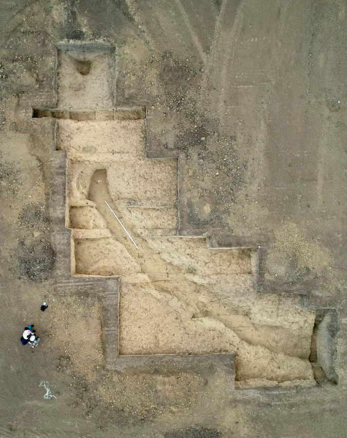 В южной его части находится разрыв шириной около трёх метров, очевидно, тут был вход на площадку. С обоих сторон от прохода около дна рва открыли завалы из костей лошадей, в том числе тазовые кости в сочленении. Здесь же лежал небольшой каменный предмет, не исключено, что это был очень упрощённый идол. На дне справа от входа нашли полный скелет собаки и отдельные кости овцы или козы.