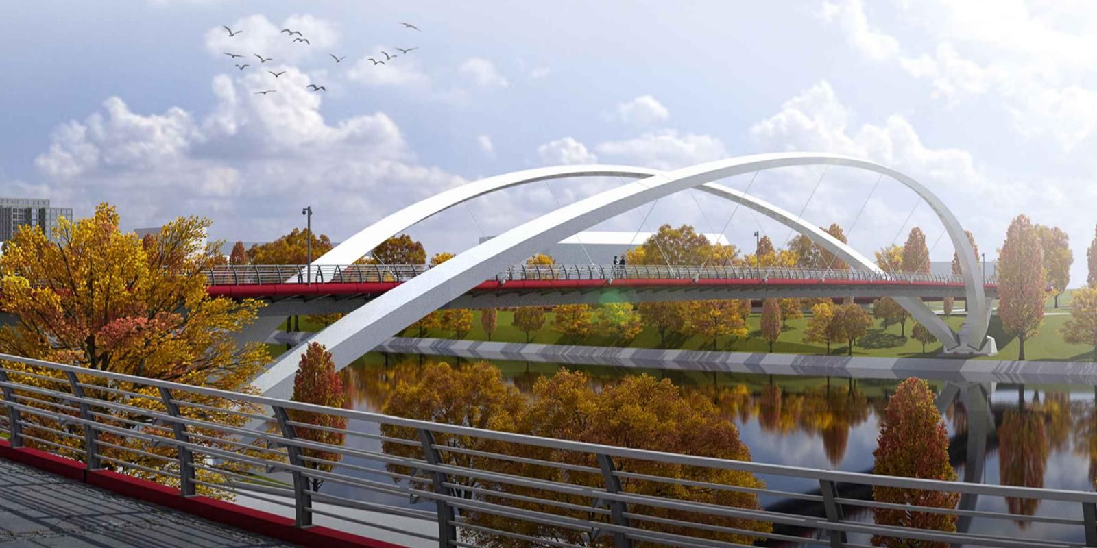 Сооружение будет эстетически перекликаться с возведенным рядом Гагаринским мостом с алыми арками. Также это гармонирует со строящимся сейчас мостом в створе ул. Островная, пролет которого также украсят декоративными деталями красного цвета.