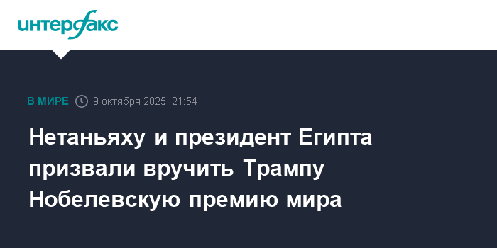 Президент Египта Абдель Фаттах ас-Сиси также считает, что Трамп должен стать Нобелевским лауреатом, сообщает газета Daily News Egypt. В телефонном разговоре с Трампом ранее в четверг президент Египта подчеркнул, что лидер США должен получить эту награду за роль в достижении Израилем и движением ХАМАС соглашения по первой фазе американского плана урегулирования в секторе Газа.