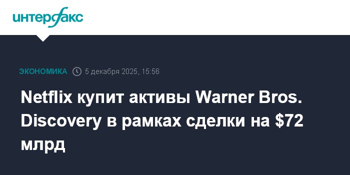Москва. 5 декабря. INTERFAX.RU - Netflix Inc. купит активы Warner Bros. Discovery (WBD), включая киностудию Warner Bros., HBO и стриминговый сервис HBO Max, в рамках сделки на $72 млрд.