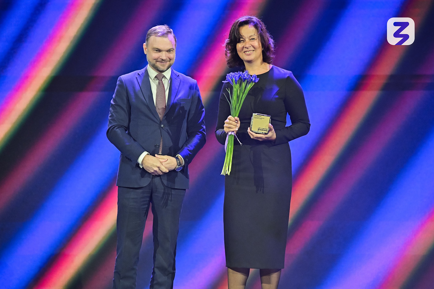 Еще одним победителем от Новгородской области стал преподаватель НовГУ высшей категории, финалист конкурса «Флагманы образования» Владимир Попов. В рамках конкурса он представил лекции про науку и технологии. Награду ему вручил генеральный директор Российского общества «Знание» Максим Древаль.