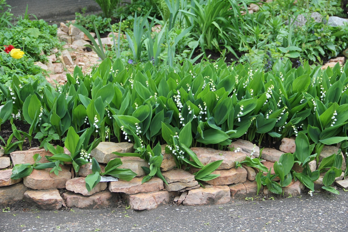 Сирень редких сортов, ландыши, папоротники, махровые маки и другие интересные растения, а также чудесный ярко-зелёный газон, который прекрасен сам по себе. И всё это красиво оформлено.