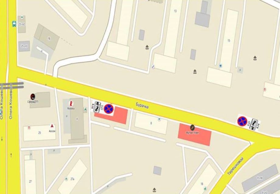 Теперь в районе домов № 6–10 по улице Бурачка запрещены остановка и стоянка автомобилей вдоль проезжей части. Новые дорожные знаки дополнены табличками «Эвакуация», предупреждающими о возможном принудительном перемещении транспортных средств.
