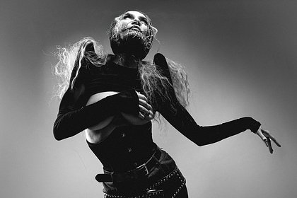 Кроме того, на размещенных черно-белых кадрах можно заметить, что Делви позировала в двух кожаных ремнях и маске, изготовленной из металлической проволоки. Также стилисты дополнили ее образ небрежными локонами и черным маникюром.