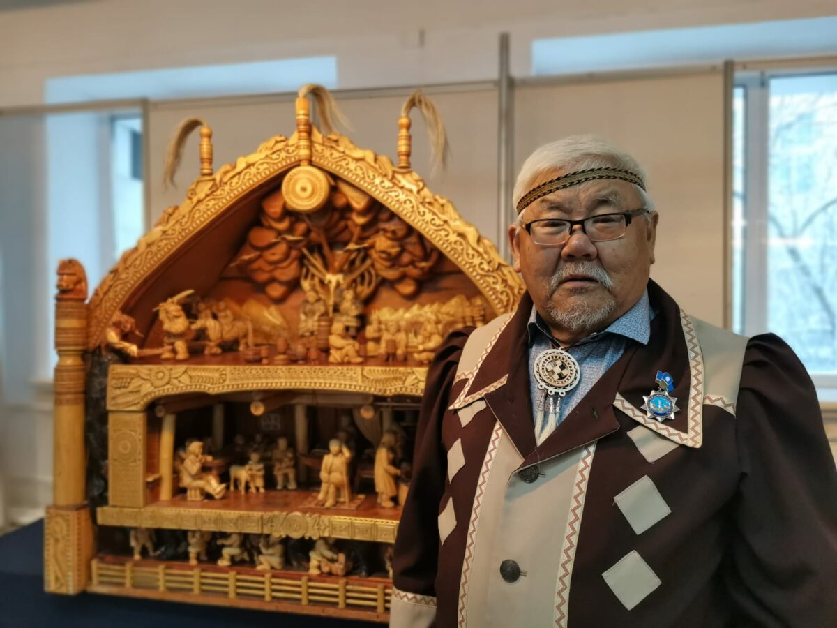 На выставке представлена цельная композиция «Сказание Олонхо у богатого Тойона», которую мастер вырезал в течение 2007 и 2008 годов.