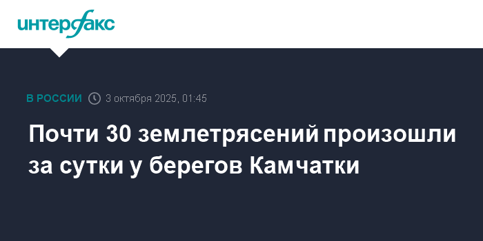 Москва. 3 октября. INTERFAX.RU - Афтершоки продолжаются у берегов Камчатки после мощного землетрясения, которое случилось 30 июля, за сутки зарегистрировано почти 30 заметных подземных толчков, сообщает в пятницу Главное управление МЧС России по региону в пятницу.