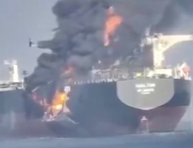 В сеть попал видеоролик: на танкере Adalynn в Оманском заливе продолжается пожар. Он вспыхнул после того, как поздно вечером 16 июня на него наскочил супертанкер Front Eagle, который шел из Ирака в Китай. Видно, что судно получило серьезное повреждение кормы с правого борта.