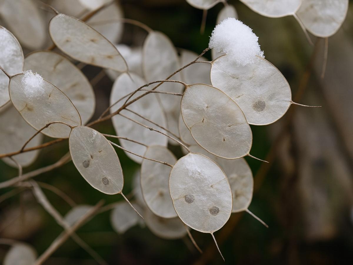 "Монетки" сохраняются всю зиму, отражая свет и создавая эффект мерцания даже под снегом. Ветви с семенными коробочками можно срезать и использовать в зимних композициях, букетах или гербариях — они долго не теряют формы.