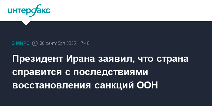 В мире19 сентября 2025Иран считает решение СБ ООН по санкциям поспешным и несправедливымЧитать подробнееРанее в этом году "евротройка" (Франция, Великобритания и ФРГ) запустила механизм восстановления санкций, так как сочла, что Иран нарушает прежние договоренности по атомной программе. 19 сентября СБ ООН не принял проект резолюции, который бы позволил избежать восстановления этих ограничительных мер. Таким образом, если ситуация не изменится, в конце сентября санкции будут автоматически восстановлены.