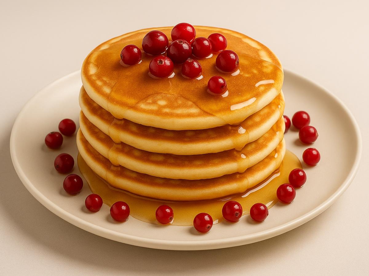 Фото: Generated by AI (DALL·E 3 by OpenAI) is licensed under Free for commercial use (OpenAI License) Панкейки с кедровым сиропом и брусникой Основная идея рецептаЭти панкейки получаются плотными, но мягкими, со слегка пористой структурой. Сублимированные фрукты добавляют выраженный аромат, сохраняя при этом аккуратный внешний вид теста — ягоды не дают лишнюю влагу, как это бывает со свежими. Летом рецепт можно адаптировать, используя сезонные ягоды, а зимой возвращаться к сублимированным продуктам, не теряющим вкуса.