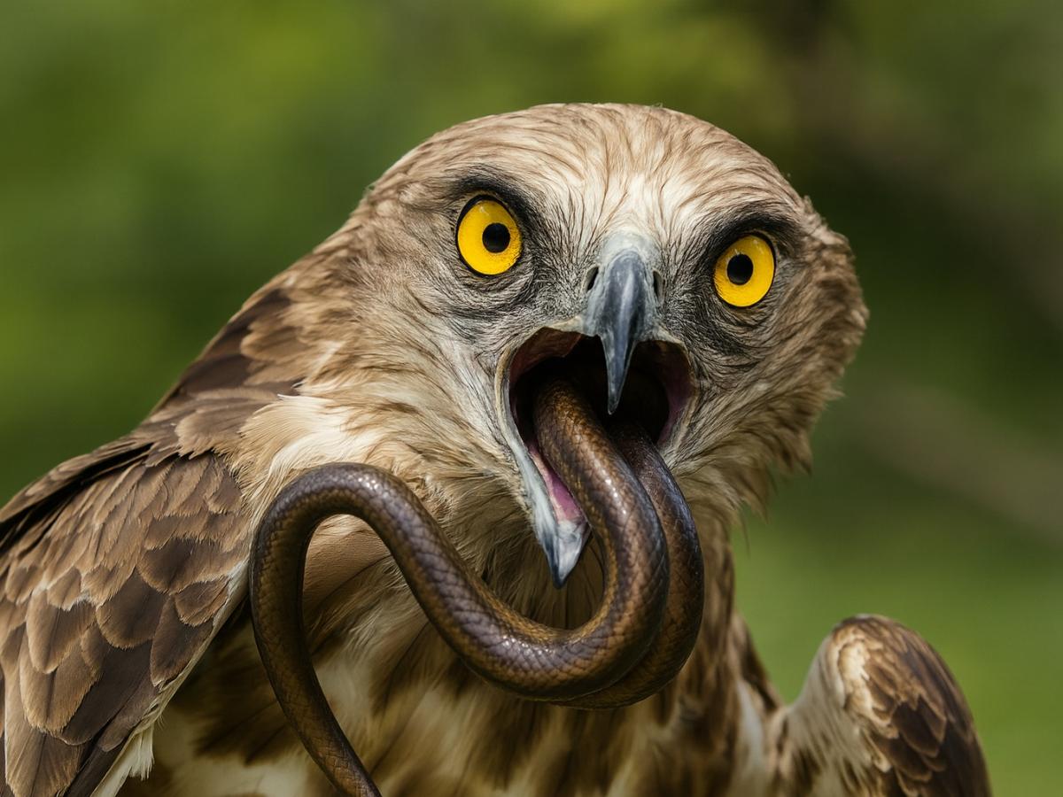 Фото: Generated by AI (DALL·E 3 by OpenAI) is licensed under Free for commercial use (OpenAI License) Змееяд с добычей в клюве Кто он — гроза гадовОбыкновенный змееяд (Circaetus gallicus) — крупная хищная птица из семейства ястребиных. Его длина тела достигает 70 сантиметров, а размах крыльев — почти два метра. Самки, как это часто бывает у пернатых, крупнее самцов — и именно они задают тон в их дуэте.