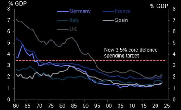 Уже и так инвесторы со всего мира очень скептически оценивали обещания стран НАТО нарастить военные траты до 3,5% от ВВП. Для Германии или Франции это бы означало возвращение на уровень, который в последний раз фиксировался в 1960-х годах. К тому же сейчас во Франции острый бюджетный кризис, а дефицит достигает рекордных 6% от ВВП.Не лучше дела и у Британии. Лейбористы на днях обнаружили очередную дыру в бюджете размером еще в 50 млрд фунтов. Для затыкания бреши властям приходится ударными темпами занимать все больше денег, чтобы расплачиваться по старым долгам, иначе придется объявлять дефолт.