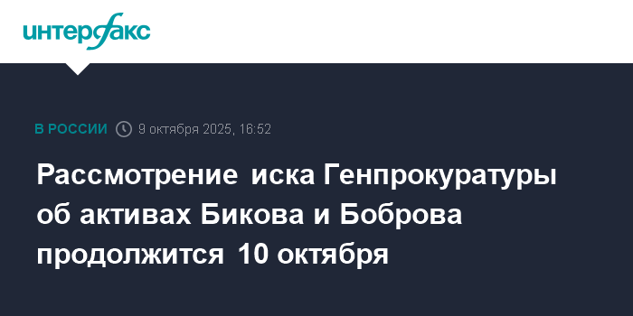 Рассмотрение иска Генпрокуратуры об активах Бикова и Боброва продолжится 10 октября