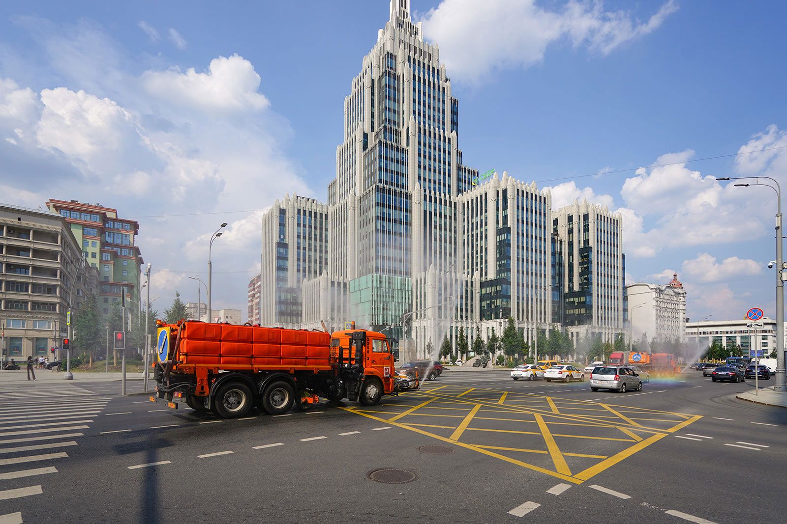 В цикличном режиме промывают водой асфальтобетонные и плиточные покрытия на всей ширине проезжей части. Рано утром или в вечерние часы обильно поливают зеленые насаждения: деревья, газоны и цветники.