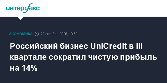 Москва. 22 октября. INTERFAX.RU - Итальянский UniCredit в третьем квартале 2025 года сократил чистую прибыль российского бизнеса на 14,3% год к году - до 238 млн евро, говорится в сообщении группы.