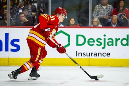 Российский нападающий клуба «Калгари Флэймс» Матвей Гридин в дебютном матче в Национальной хоккейной лиге. Статистика игрока доступна на сайте лиги.
