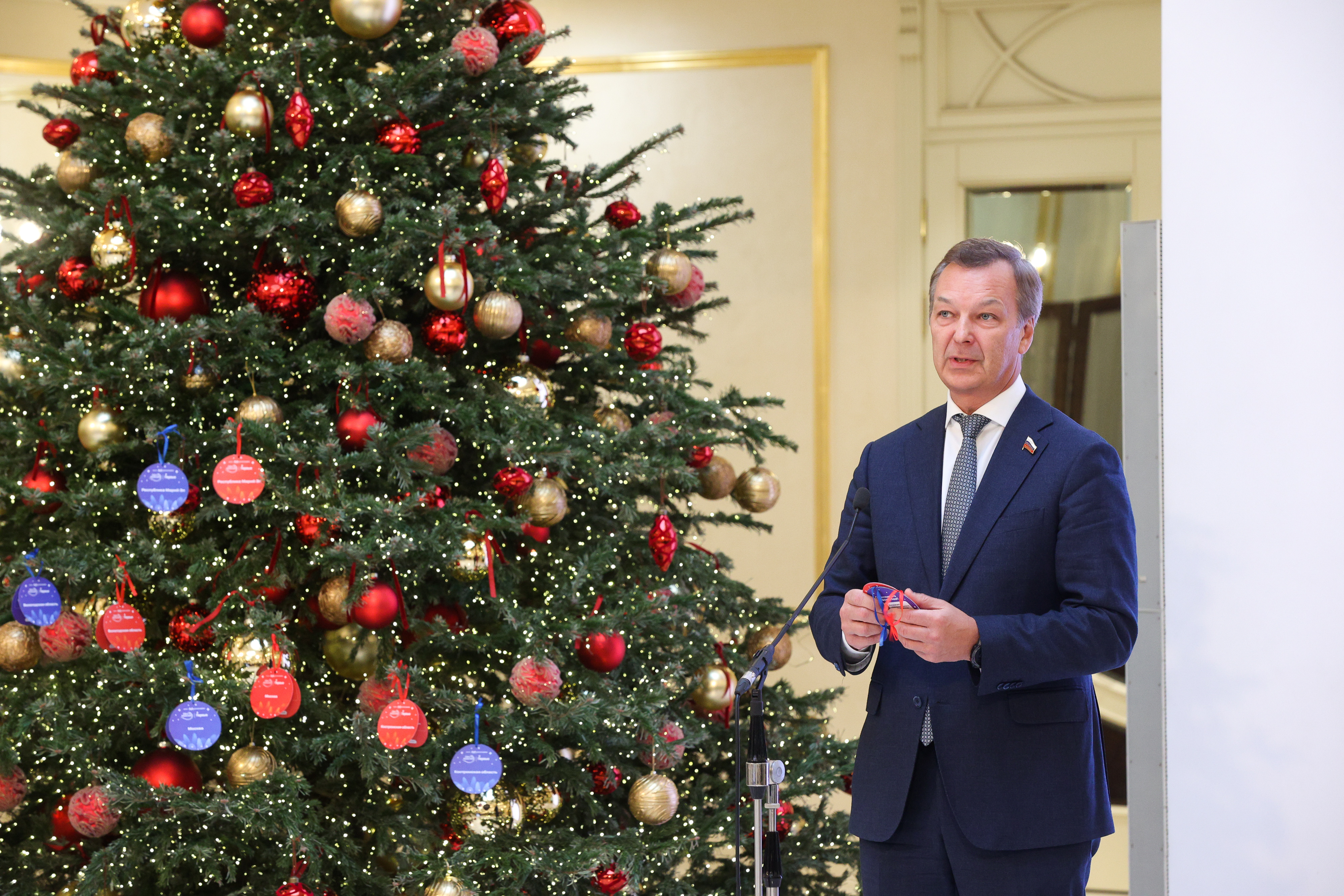 Андрей Яцкин первый заместитель Председателя СФШары с праздничного дерева сняли также вице-спикеры палаты регионов Юрий Воробьёв, Николай Журавлёв, Константин Косачёв и Инна Святенко. Они пожелали ребятам здоровья, удачи в их делах и волшебного Нового года.