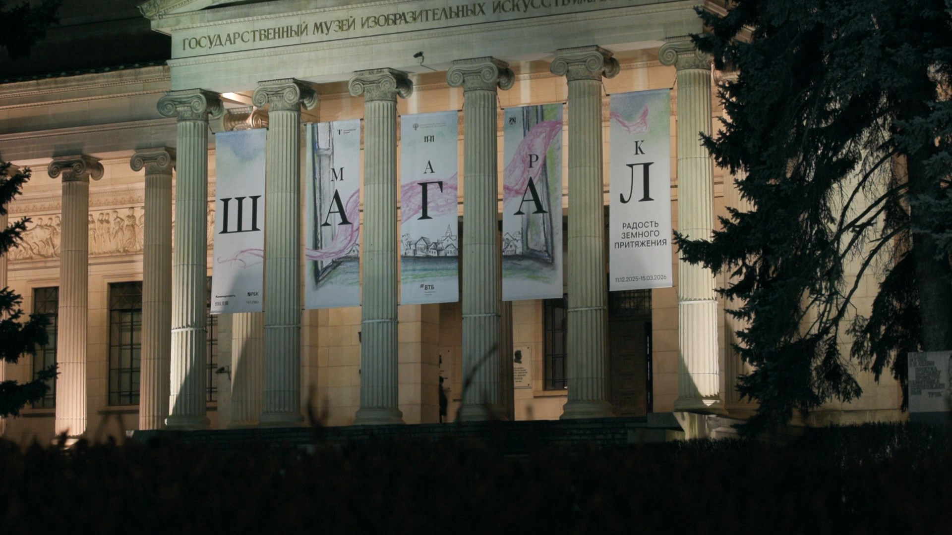 Для того, чтобы попасть на выставку, нужно в каком-то смысле тоже воспарить, как герои многих шагаловских полотен, и подняться по мраморной лестнице словно в храм искусства, на фронтоне которого мы видим главный экспонат — картину “Прогулка” из собрания Русского музея. На время она переехала из Петербурга в Москву.
