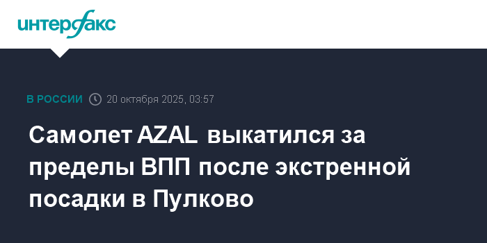 В России20 октября 2025Возвращающийся в Пулково Airbus A320 AZAL подал сигнал бедствияЧитать подробнее"Произошло выкатывание за пределы ВПП. Пострадавших нет", - сказал собеседник агентства.