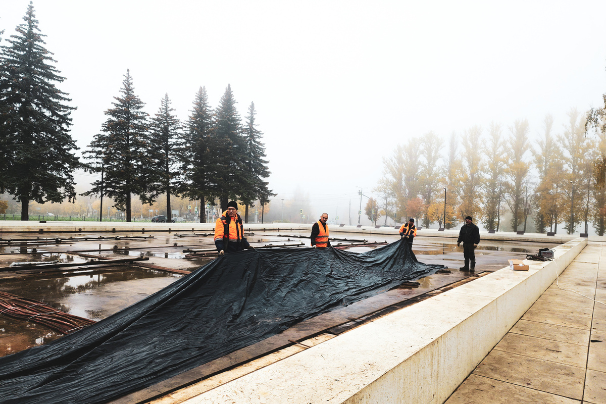 На время зимнего сезона были демонтированы и отправлены на хранение фильтры и светильники. Для дополнительной защиты конструкции специалисты установили в нишу фонтана специальную металлическую конструкцию. Фото: Мария Панина / МедиаБанк Подмосковья