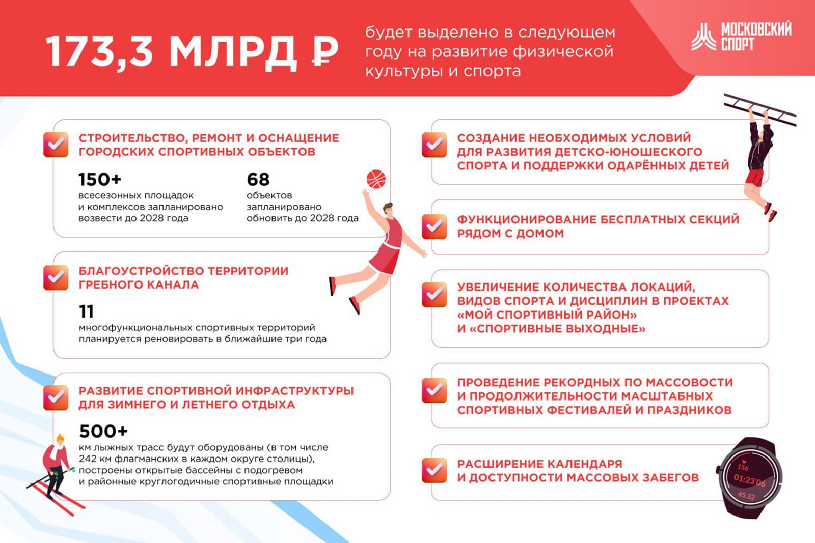 Москва продолжит создавать необходимые условия и инфраструктуру для здорового и активного образа жизни горожан. В следующем году на развитие физической культуры и спорта будет выделено 173,3 миллиарда рублей. Об этом в своем канале в мессенджере MAX сообщил Сергей Собянин.
