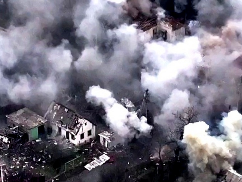 Видно, что многочисленные всполохи взрывов практически сливаются в одно зловещее серое облако, которое туманом покрывает развалины бывших убежищ вэсэушников.