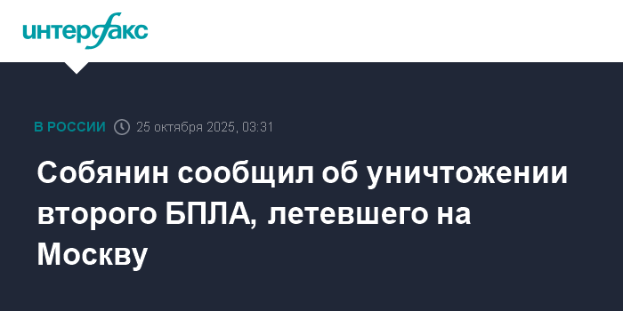 Москва. 25 октября. INTERFAX.RU - Уничтожен еще один беспилотник, направлявшийся к столице, сообщил мэр Москвы Сергей Собянин.