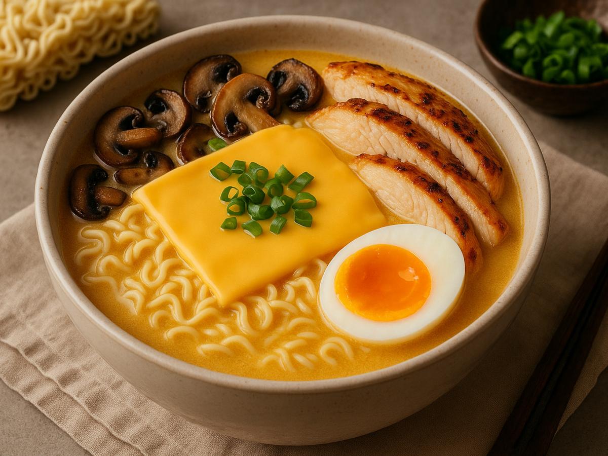 Фото: Generated by AI (DALL·E 3 by OpenAI) is licensed under Free for commercial use (OpenAI License) Сырный рамен ИнгредиентыДля трёх порций понадобится 250 г куриного филе, два яйца, 200 г шампиньонов, пакетик рамена (60 г), 150 мл сливок, три ломтика плавленого сыра и одно перо зелёного лука. Из приправ — 30 г соуса терияки, соль, перец и специи из пакетика с лапшой. Также подготовьте 800 мл воды и немного растительного масла.