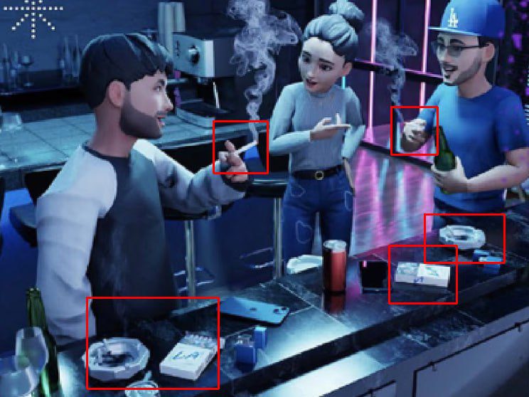 В качестве примера издание приводит скриншот, сделанный в одной из метавселенных, где изображена компания друзей за совместным перекуром: в руках дымятся сигареты, на барной стойке – пачка из под них и пепельница.