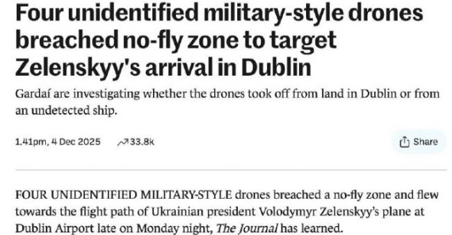 БПЛА взлетели с северо-востока Дублина, пока, однако, неясно, с суши или с незамеченного корабля, добавили источники. Позже эти же дроны кружили над кораблем ирландских ВМС LÉ William Butler Yeats, тайно развернутого в Ирландском море перед визитом Зеленского, пишет издание.