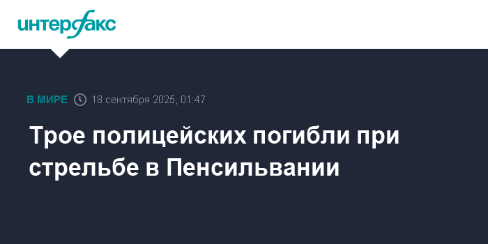 Москва. 18 сентября. INTERFAX.RU - Трое полицейских погибли при стрельбе в Пенсильвании (США), еще двое ранены и находятся в критическом состоянии, сообщил телеканал NBC News.
