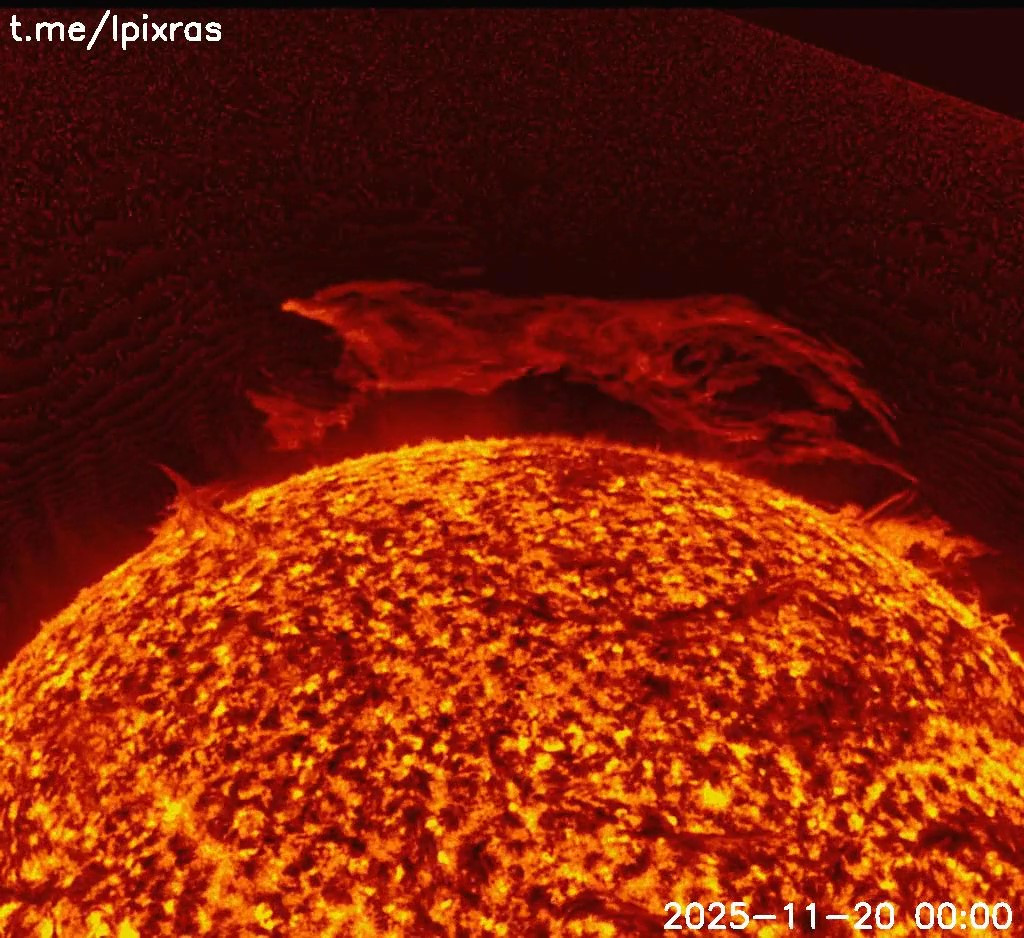 Ночью 20 ноября на северном полюсе звезды сформировался и отделился огромный солнечный протуберанец, размеры которого в момент отрыва превысили 1 миллион километров. Для сравнения — это примерно в 80 раз больше диаметра Земли.