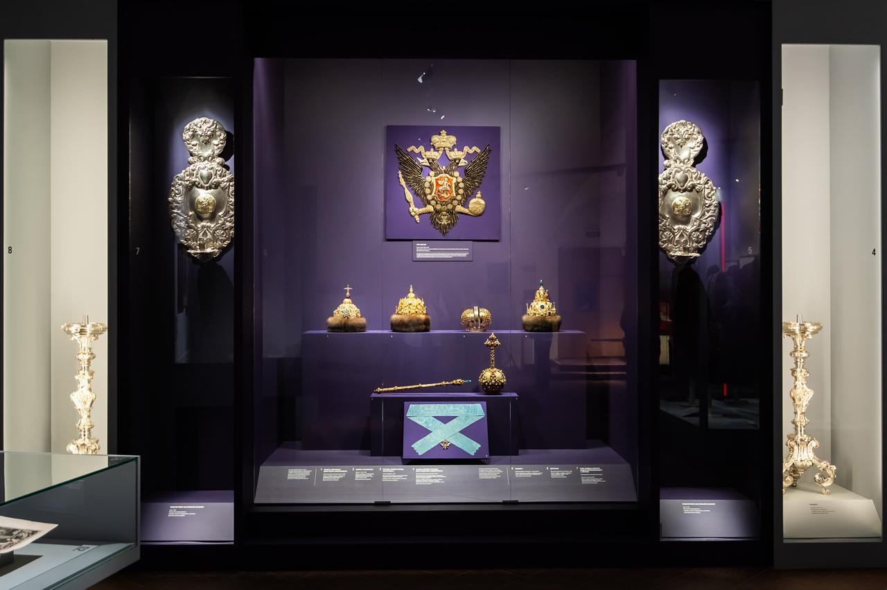 Так, на выставке можно увидеть посмертную маску Петра Великого, государственные регалии, роскошное конское убранство, доспехи, портреты и редчайшие изображения траурных кортежей, а также памятные вещи, раздававшиеся почетным гостям погребальных церемоний в ту эпоху – например, мемориальные кольца и ложки. Особое место в экспозиции также отведено богато иллюстрированным изданиям, посвященным «траурным торжествам» европейских правителей.