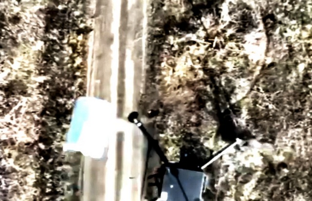 БПЛА противника завис и, судя по всему, готовился совершить сброс на находящееся на дороге транспортное средство. Поэтому наш оператор проявил смекалку и сбросил на вражескую цель жестяную банку.