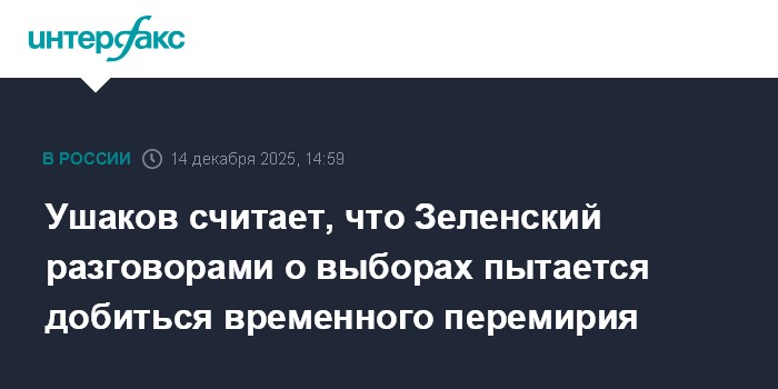 Москва. 14 декабря. INTERFAX.RU - Президент Украины Владимир Зеленский заявил о выборах на Украине под давлением США, с помощью этого он пытается добиться перемирия на время, после которого возобновить боевые действия, заявил помощник президента РФ Юрий Ушаков.