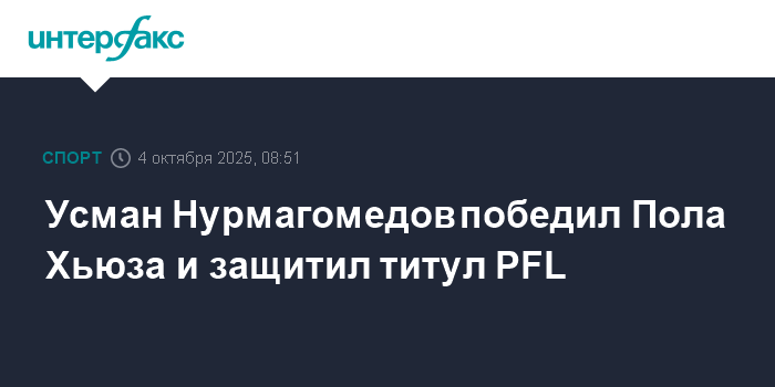 Москва. 4 октября. INTERFAX.RU - Российский боец смешанного стиля Усман Нурмагомедов одержал победу над ирландцем Полом Хьюзом в поединке за чемпионский пояс Профессиональной бойцовской лиги (PFL, экс-Bellator) в легком весе.