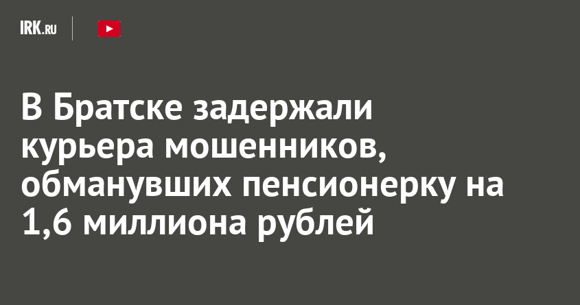 В Братске правоохранительные органы задержали 20-летнего жителя Магадана, подозреваемого в работе курьером в преступной схеме. Молодой человек участвовал в мошенничестве, во время которого у 84-летней местной жительницы были похищены более 1,6 миллиона рублей, сообщили в телеграм-канале «МВД Братск».